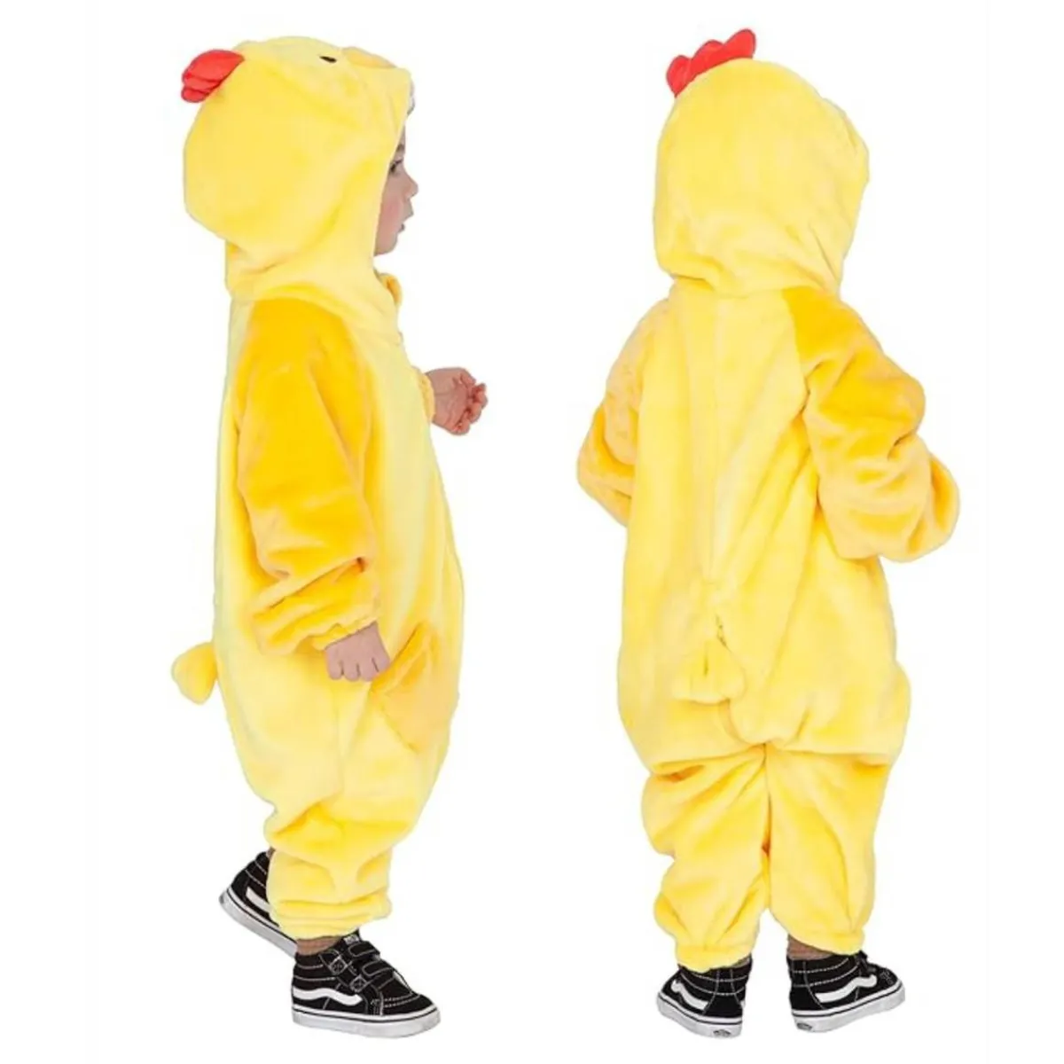 Fabricado en 100% poliéster de alta calidad, este disfraz es suave, ligero y cómodo, pensado para resistir horas de juego activo. Viene en una sola pieza con una capucha que simula la cabeza de un pollito, una graciosa cola y un sistema de sonido integrado que emite un auténtico «pio-pio» al presionar un botón, lo que hará las delicias de los más pequeños. ¡Diversión garantizada con cada paso y cada sonido!