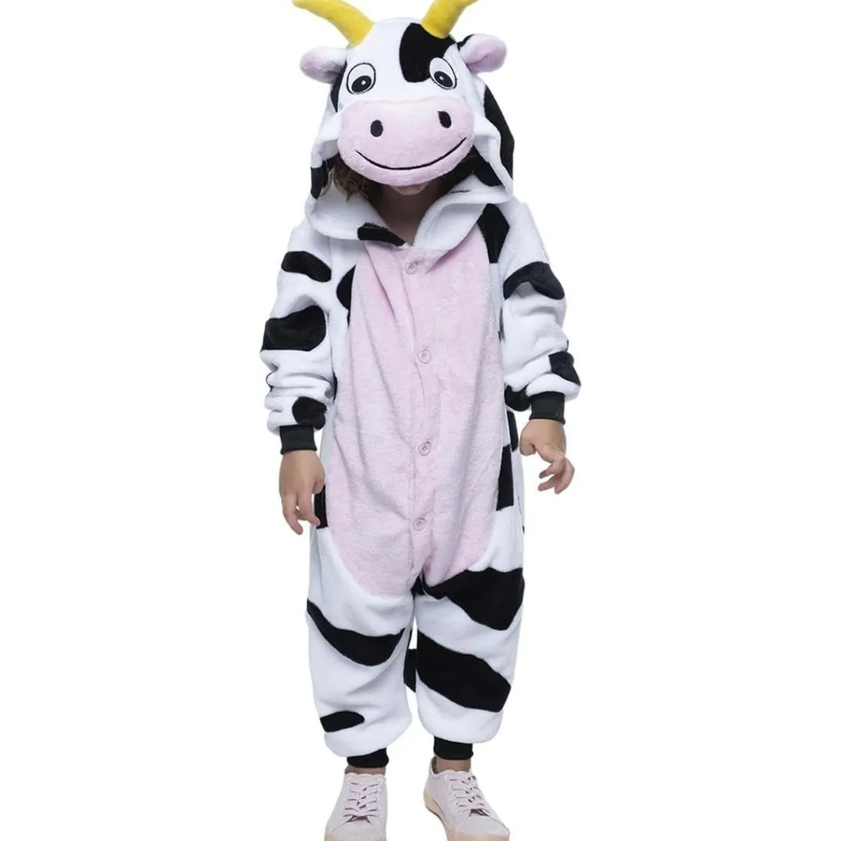 La capucha o gorro de este traje no sólo es calentita y suave, sino que viene equipada con enormes cuernos de vaca, añadiendo realismo y diversión al conjunto. Es fácil de poner y se ajusta cómodamente para que los peques puedan jugar y disfrutar sin molestias.