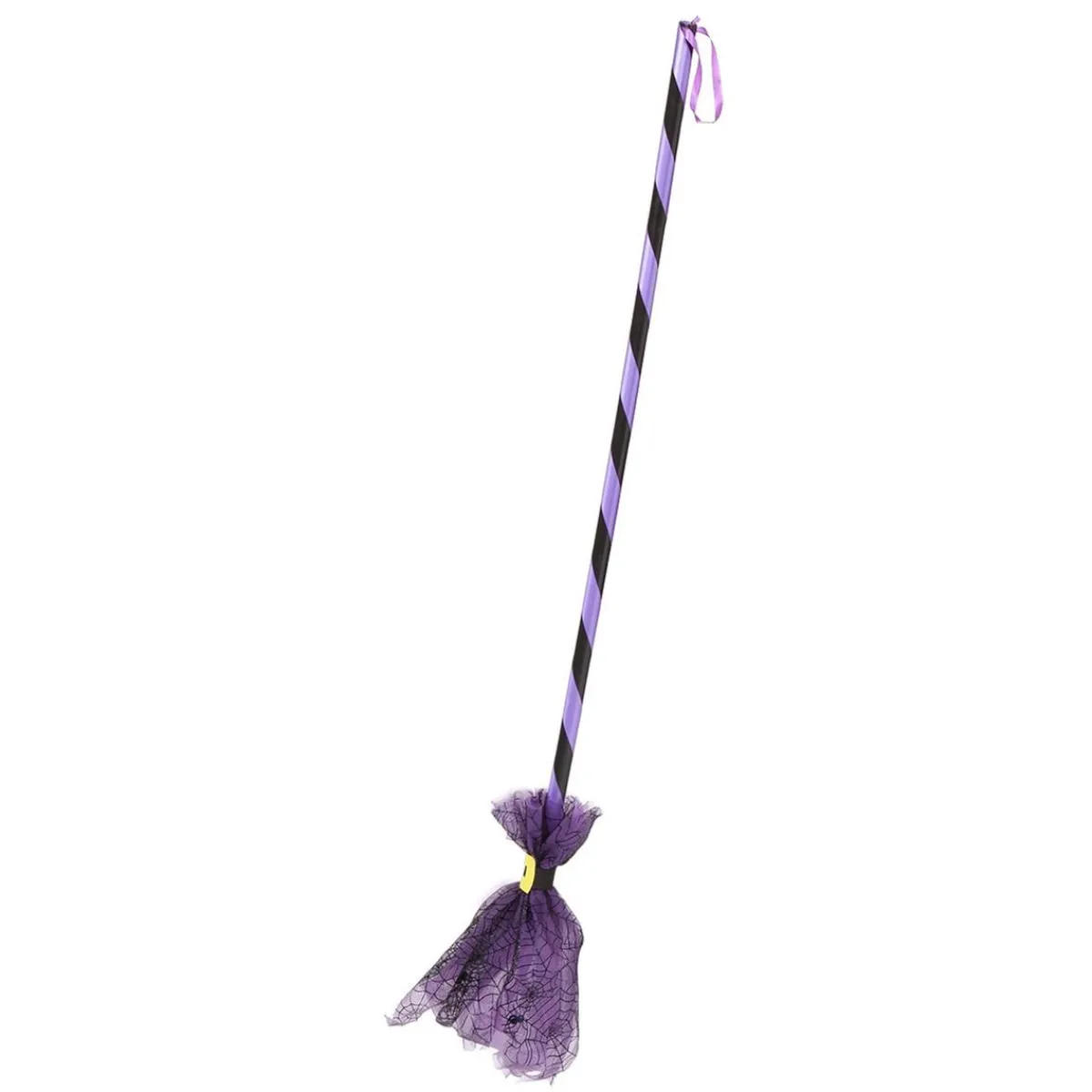 La escoba está adornada con un elegante detalle de telaraña sobre tul lila, que le da un toque festivo y espeluznante. Ideal para complementar disfraces de bruja, hechicera o cualquier personaje mágico.