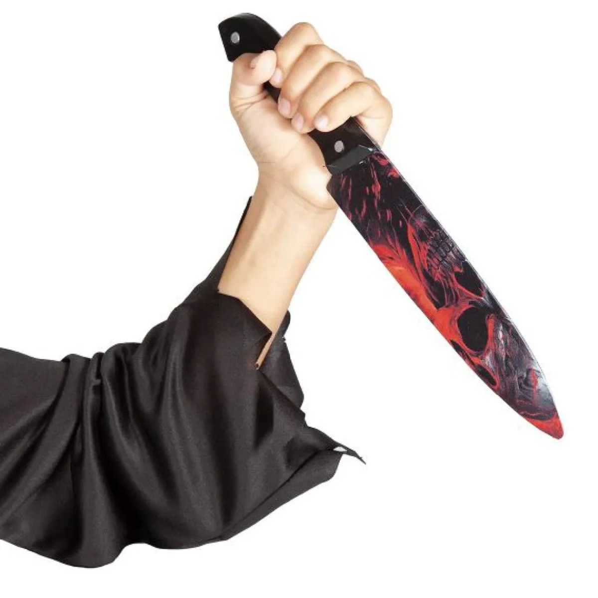 ¡Dale un toque macabro a tu disfraz! Este cuchillo Skull de 30 cm aprox. con detalles impresos es el accesorio perfecto para completar tu look de zombie, asesino o personaje de terror en Halloween.