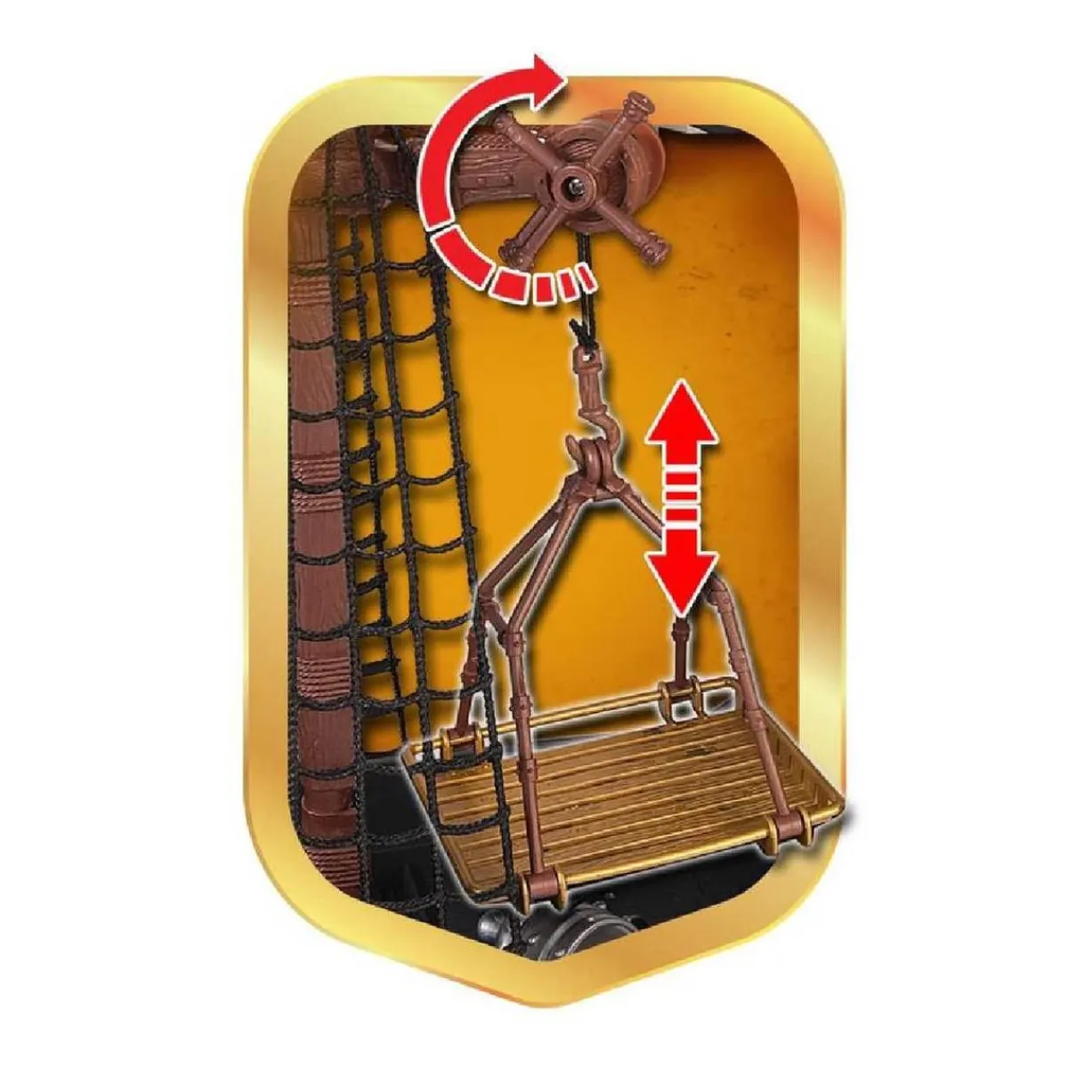 La plataforma sube y baja mediante una manivela. ¡El barril se ilumina en la oscuridad para aún más magia!