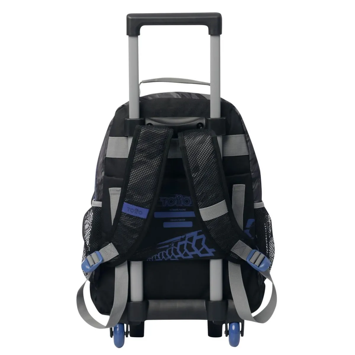 Su diseño muestra a un motero con casco montado en una superbike, en una combinación potente de azul, gris y negro que transmite fuerza y dinamismo. Fabricada en poliéster resistente, está lista para acompañar las jornadas escolares más intensas.