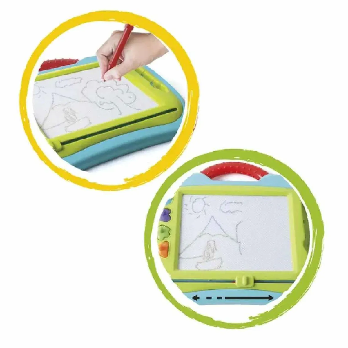Práctico, este tablero de dibujo tiene un asa para llevarlo a todas partes. Una vez terminado el dibujo, simplemente lo puedes borrar usando el cursor para comenzar un nuevo dibujo.