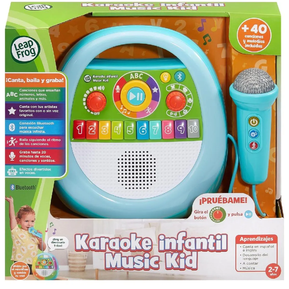 - Micrófono interactivo: Permite cantar junto a canciones pregrabadas y ajustar el volumen para una experiencia segura y divertida.
