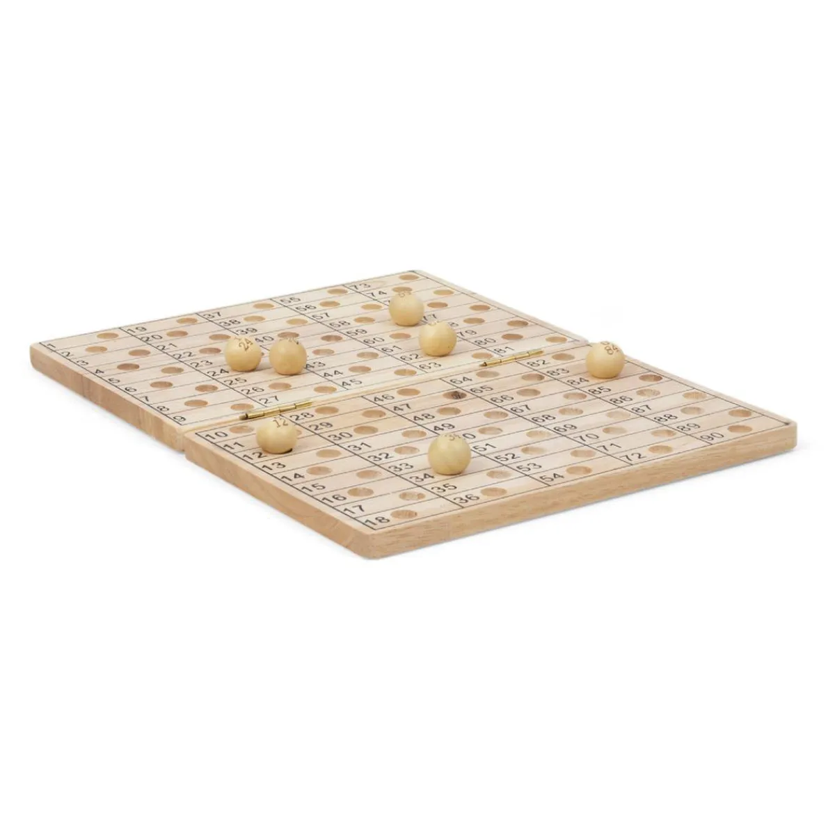 El juego contiene: Un bombo de metal, un tablero maestro de madera, 90 bolas, fichas de madera en una práctica bolsa de tela y tarjetas de juego de cartón.