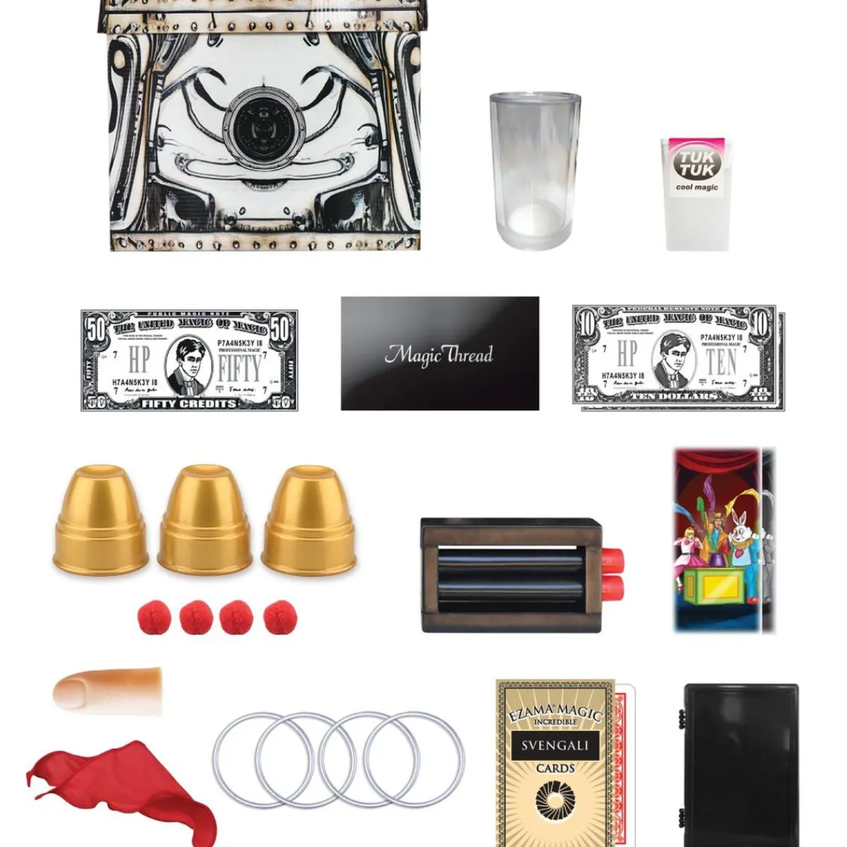 Dentro del set encontrarás una gran variedad de accesorios, como un dedo falso para los clásicos trucos de desaparición, cartas trucadas, gafas mágicas, anillos encantados y muchos otros elementos ingeniosos. Todos los componentes están adaptados al tamaño y la destreza de las manos infantiles, facilitando su manipulación y aprendizaje.
